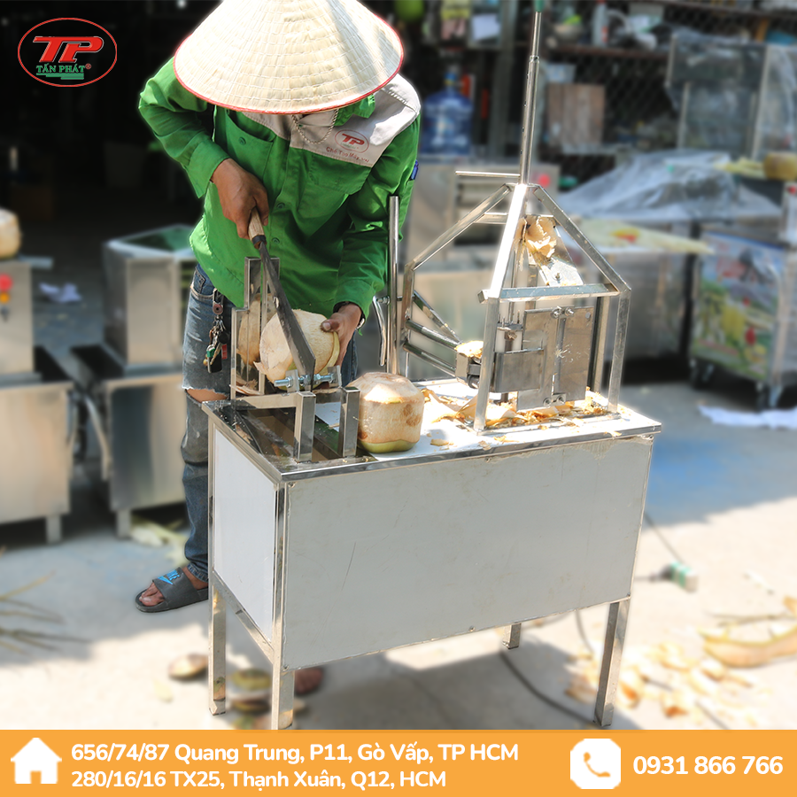 ► Hiện nay nhu cầu dùng dừa xiêm đang được ưa chuộng , khách hàng ngày nay cũng rất khó tính từ khâu gọt vỏ dừa cũng phải sạch và đẹp mắt .Thông thường , những khu du lịch và những khu vui chơi bạn chỉ thường vạt mặt trên trái dừa mới cho ống hút vào được , nhưng cũng sẽ bất tiện khi di chuyển sẽ đổ hoặc sẽ kẹt ống hút khi bạn ko mở hết vạt trên trái dừa. Và điều quan trọng là khi những khu du lịch có nhiều khách,mà bạn phải mất thời gian vạt đầu trái dừa vừa vất vả và không chuyên nghiệp. TẤN PHÁT chuyên sản xuất máy móc công nghiệp xin ra mắt dòng máy gọt vỏ dừa có dụng cụ chọc ống hút.